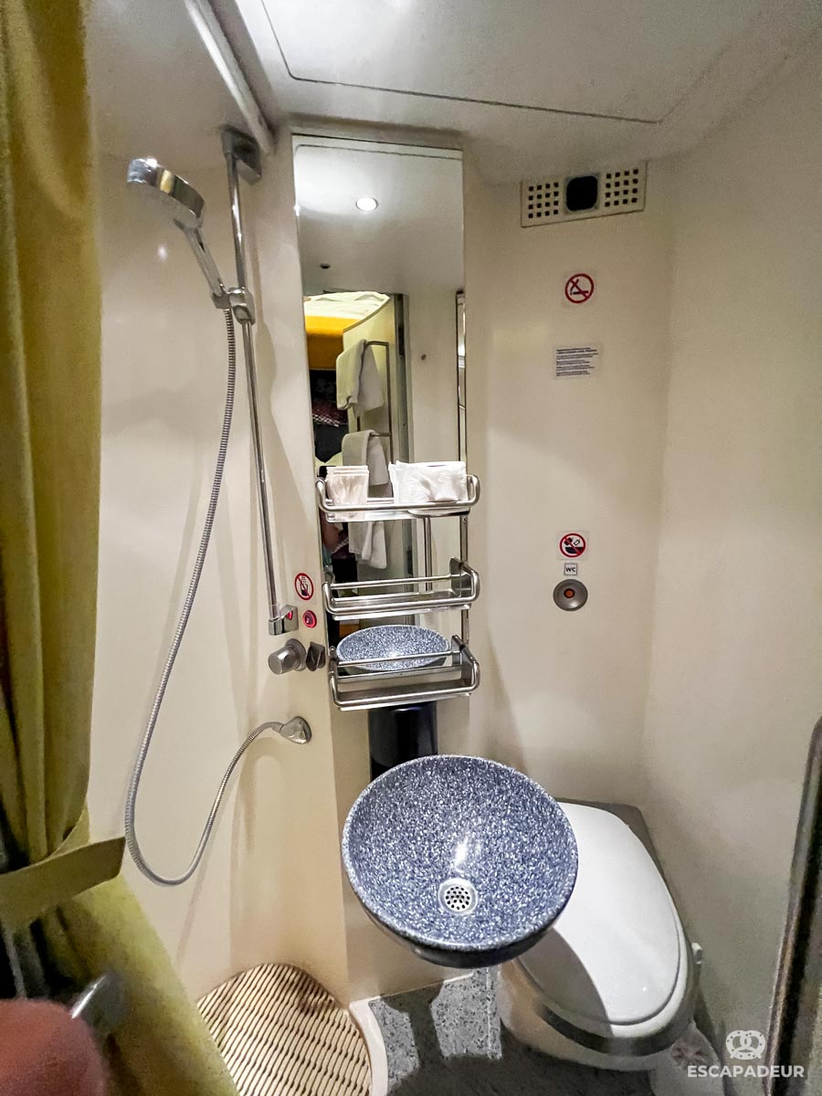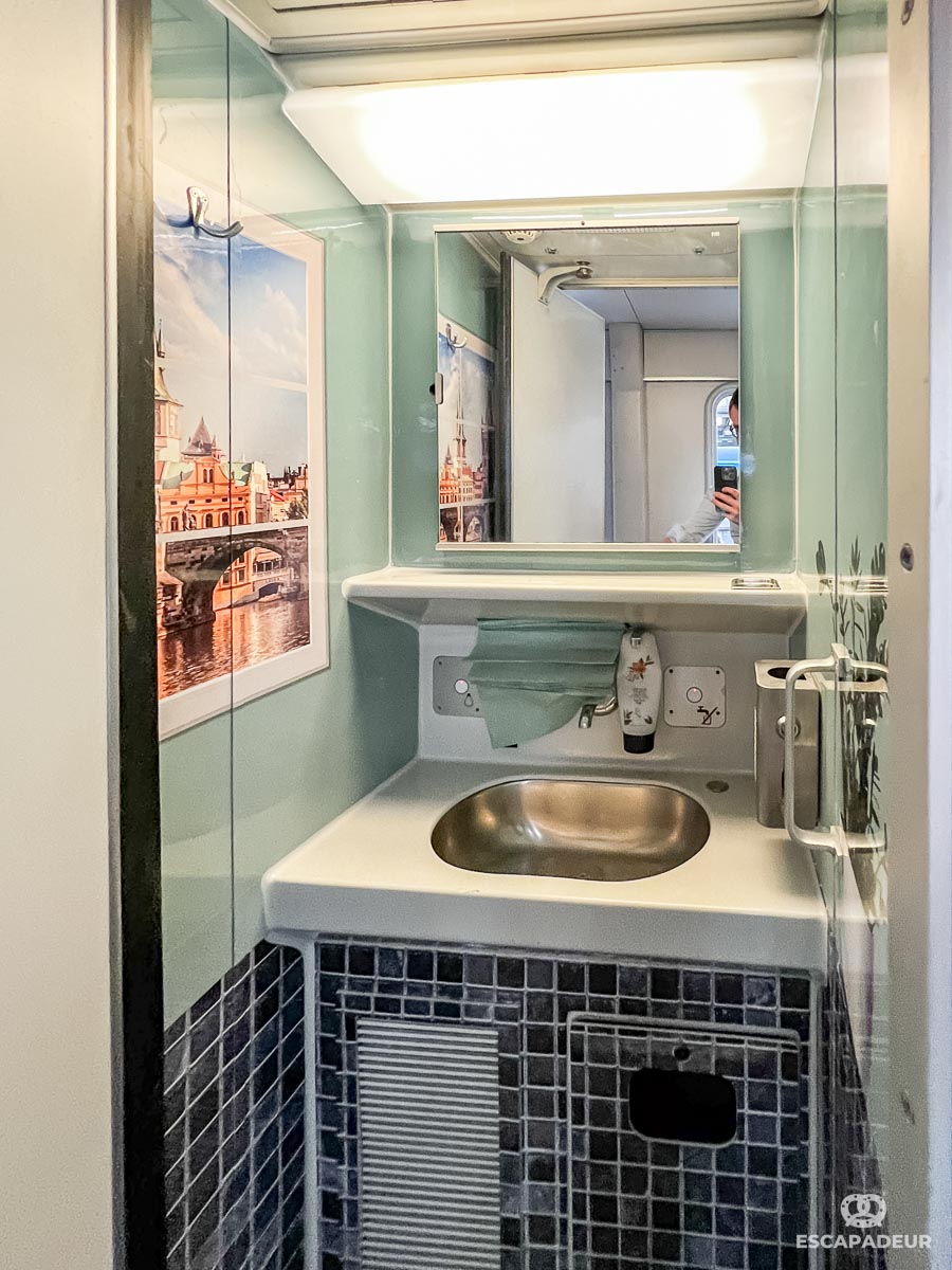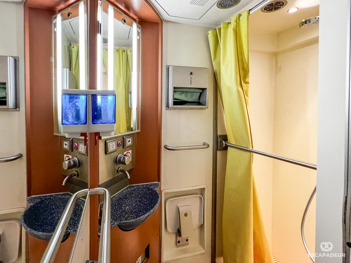 La voiture lits est équipée d'une salle de bain partagée (3è photo), je trouve qu'elle fait largement l'affaire.