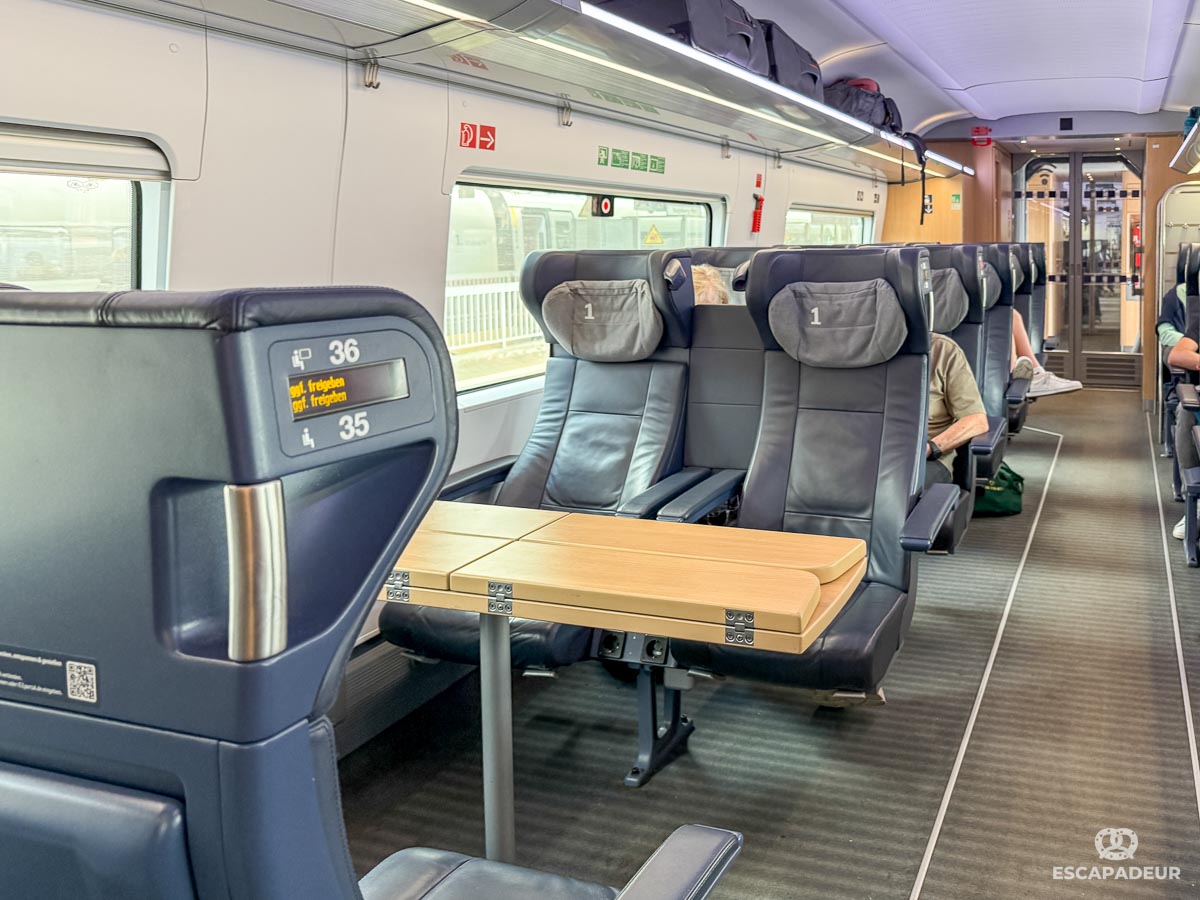 En 1ère classe d’un train ICE, les sièges sont disposés en 2+1, avec des tables pour 2 (face à face) et des tables pour 4