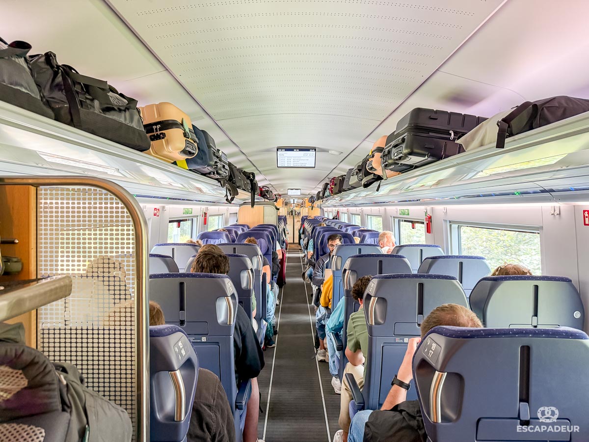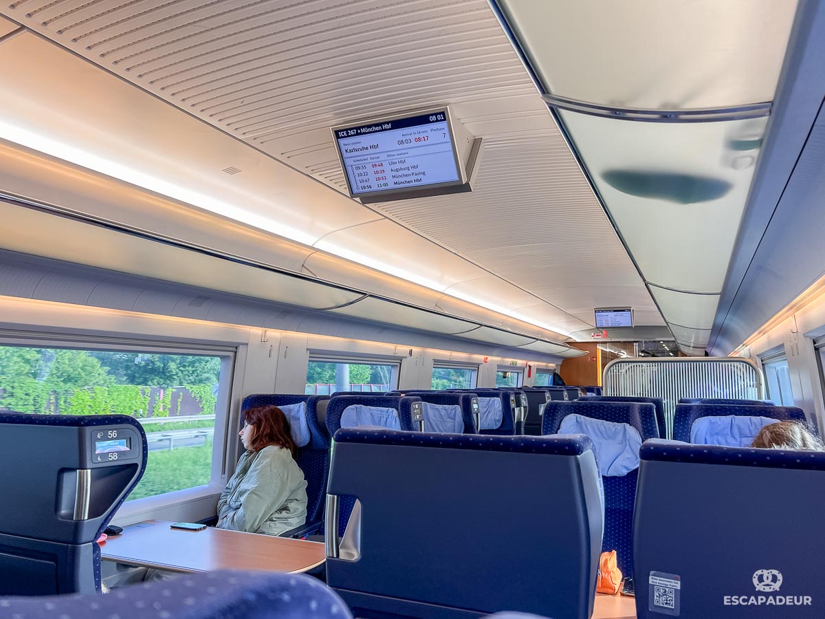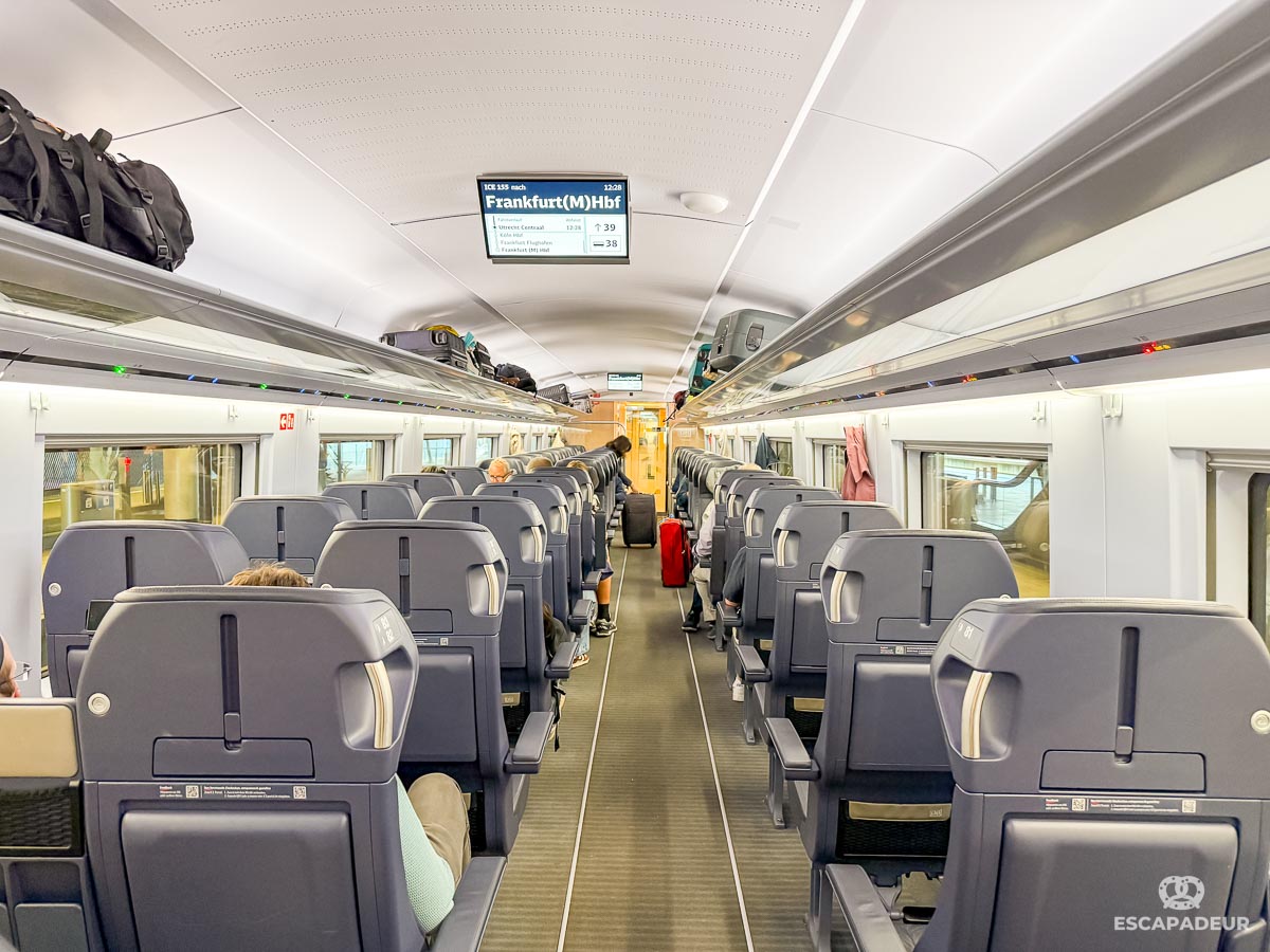 Plusieurs générations de trains ICE circulent sur le réseau allemand, les intérieurs varient d’une génération à l’autre, mais chaque train dispose de places assises avec 2 classes, de prises de courant, d’un accès au WiFi, ainsi qu’une voiture restaurant.