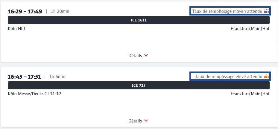 Une jauge d’affluence estimée est indiquée sur le site web de la DB (voir capture d’écran)